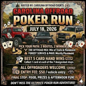 Join Carolina Off-Road Events for thrilling off-road experiences. Whether you’re a seasoned enthusiast or a newcomer, our events offer something for everyone. Sign up now to secure your spot in our upcoming activities, including trail rides, driving schools, and more. Don’t miss out on the adventure of a lifetime!